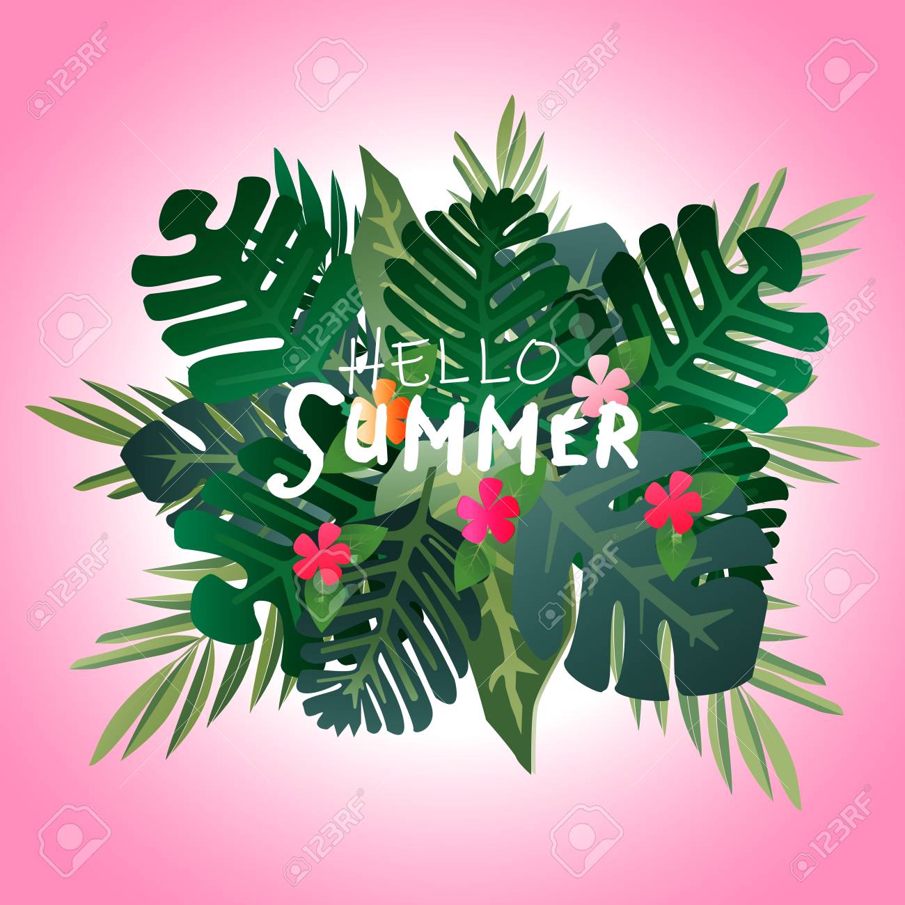 Hello Summer Tropical Green Tree Leaf And Summer Flowers