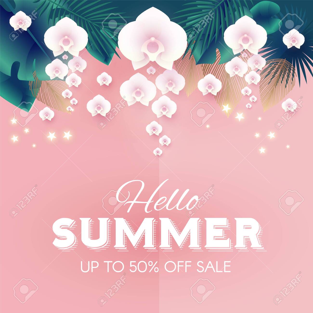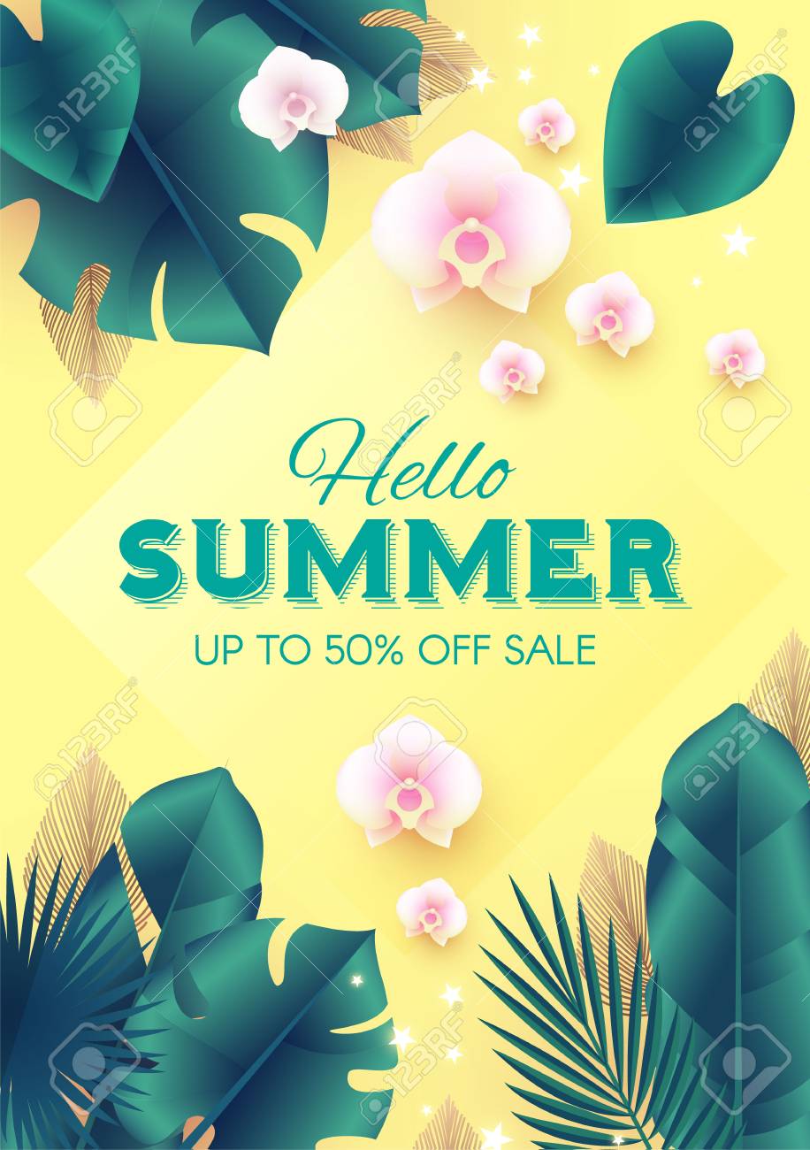 Hello Summer Tropical Design Template With Palm Leaves And Orchid Flowers