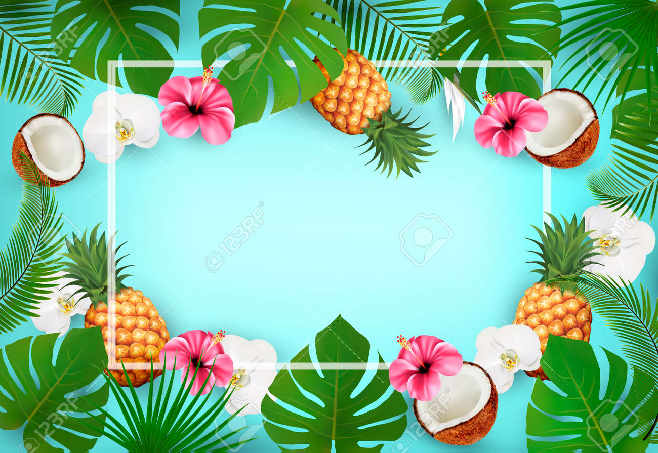 Summer Tropical Background With Exotic Palm Leaves And Flowers