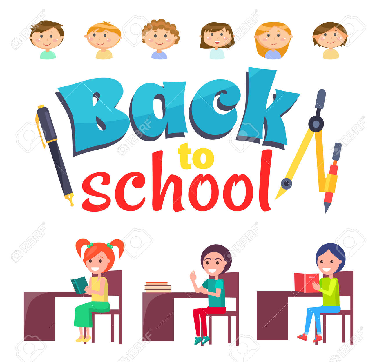 Back To School Vector Kids Sitting By Tables Loaded With Books