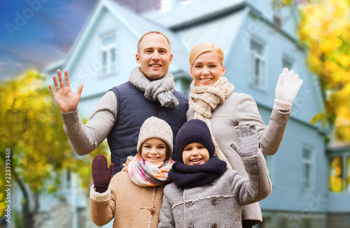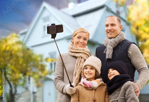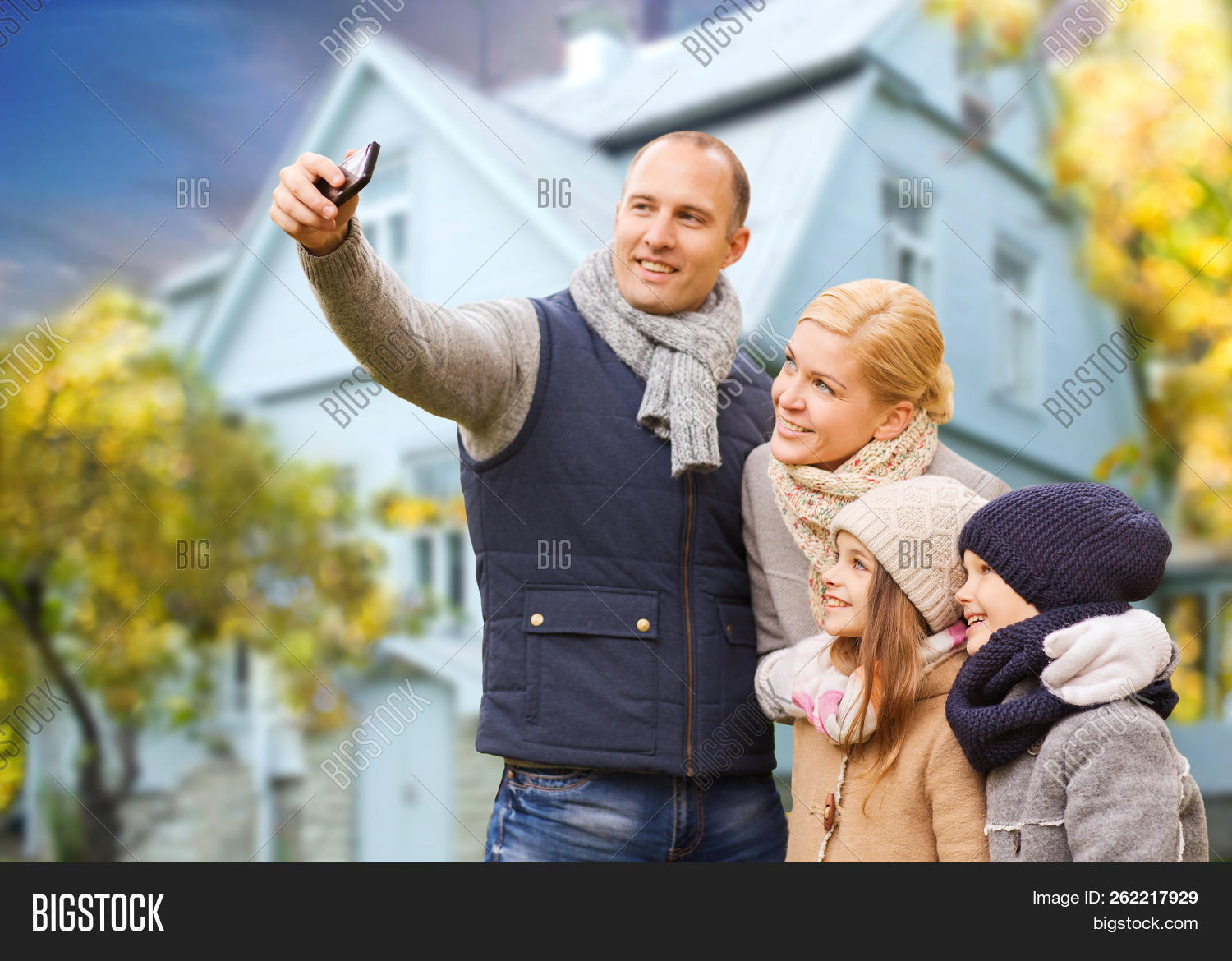 Family Takes Autumn Selfie By Cellphone Over House Stock