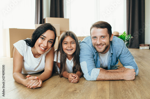Happy Mother Father And Little Daughter Hugging Standing In New Kitchen With Boxes Around Them