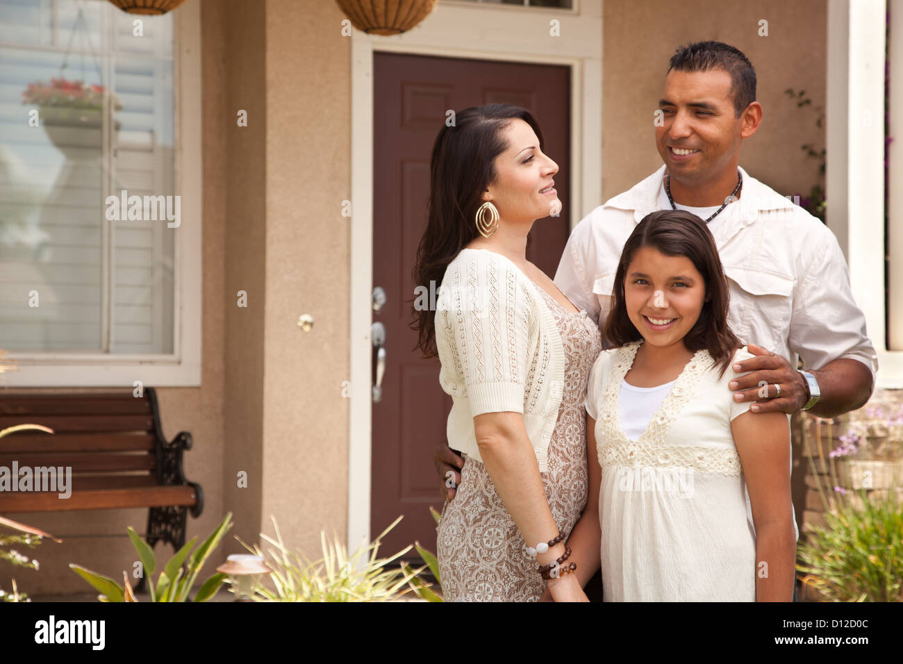 Hispanic Mother Father And Daughter In Front Of Their Home