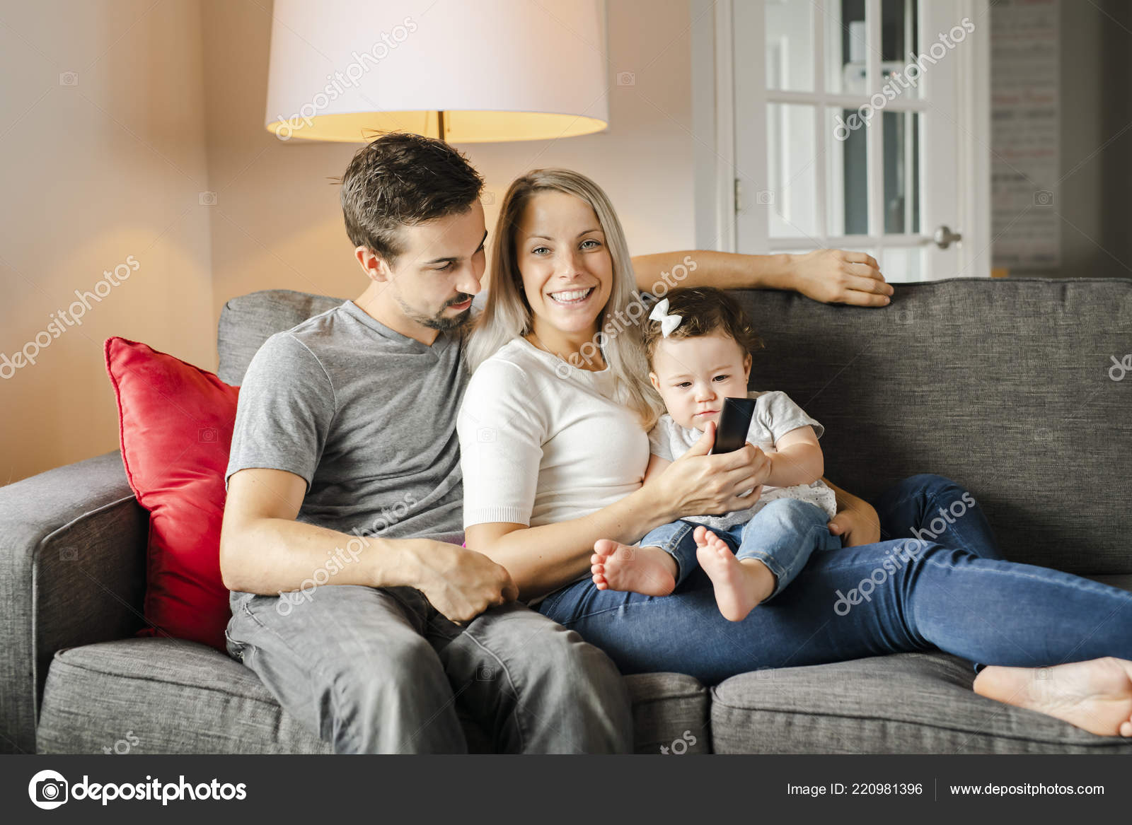 Mother Photographs Dad With Daughter On Cellphone Stock