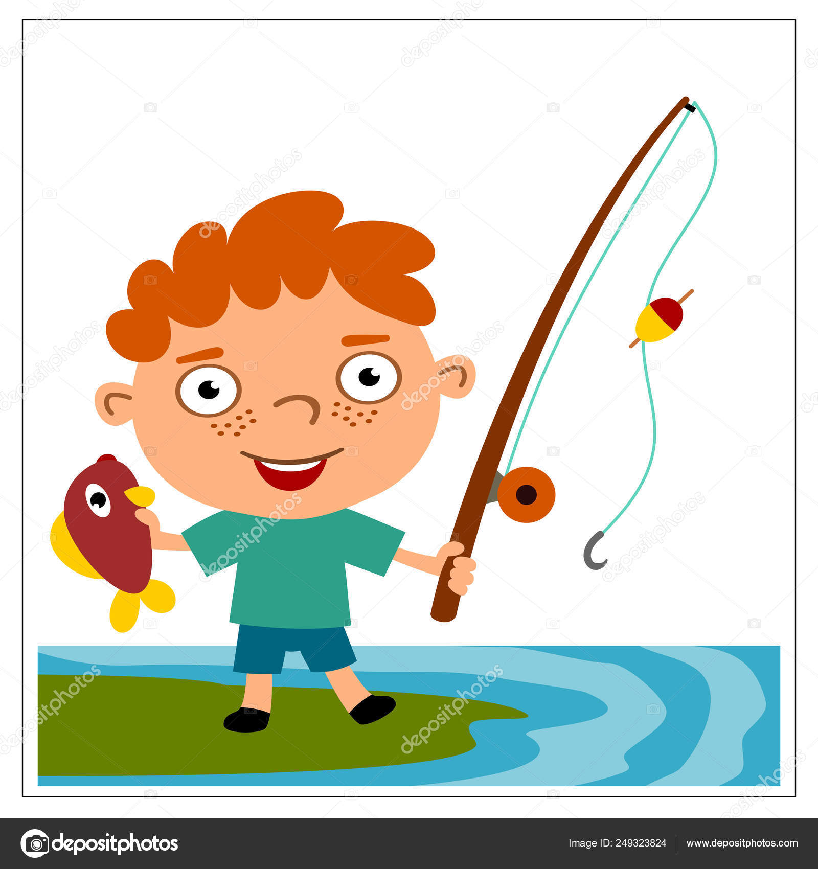 Cute Cartoon Character Boy Fisherman Holding Fishing Rod