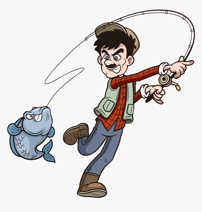 A Cartoon Of A Fisherman Holding A Fish And Fishing Rod And