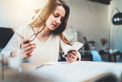 Concentrated Long Haired Woman Working From Home Using Smartphone