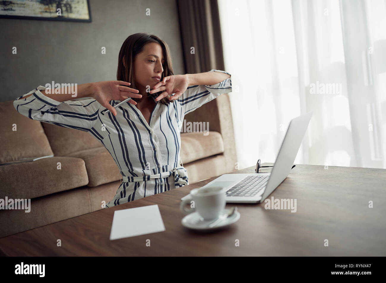 Beautiful Freelancer Woman Working Online At Her Home Stock