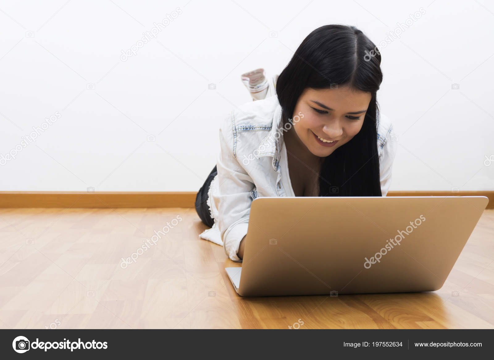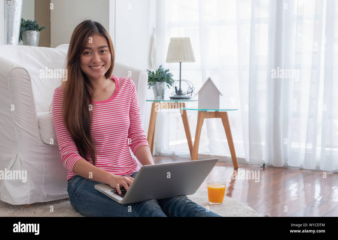 Happy Asian Woman Working On Laptop Computer At Home Female