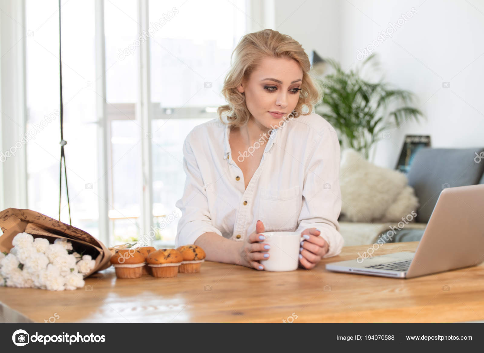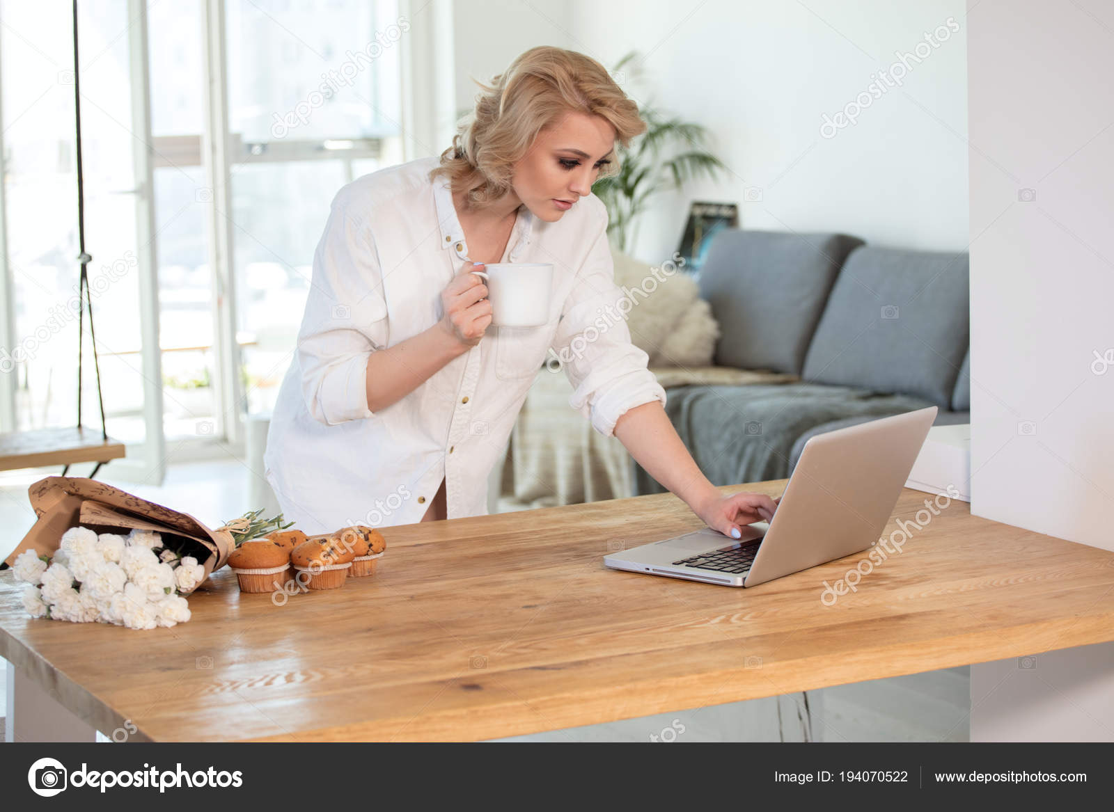Freelancer Woman Work At Home Laptop Beautiful Female In Casual