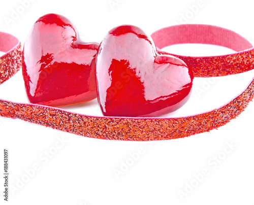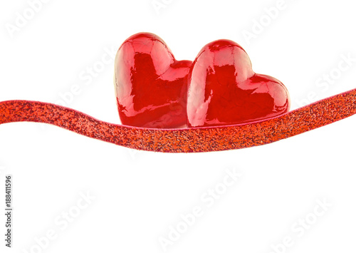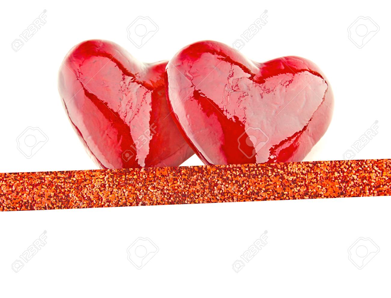Two Luxury Red Hearts With Ribbon On White Background Happy