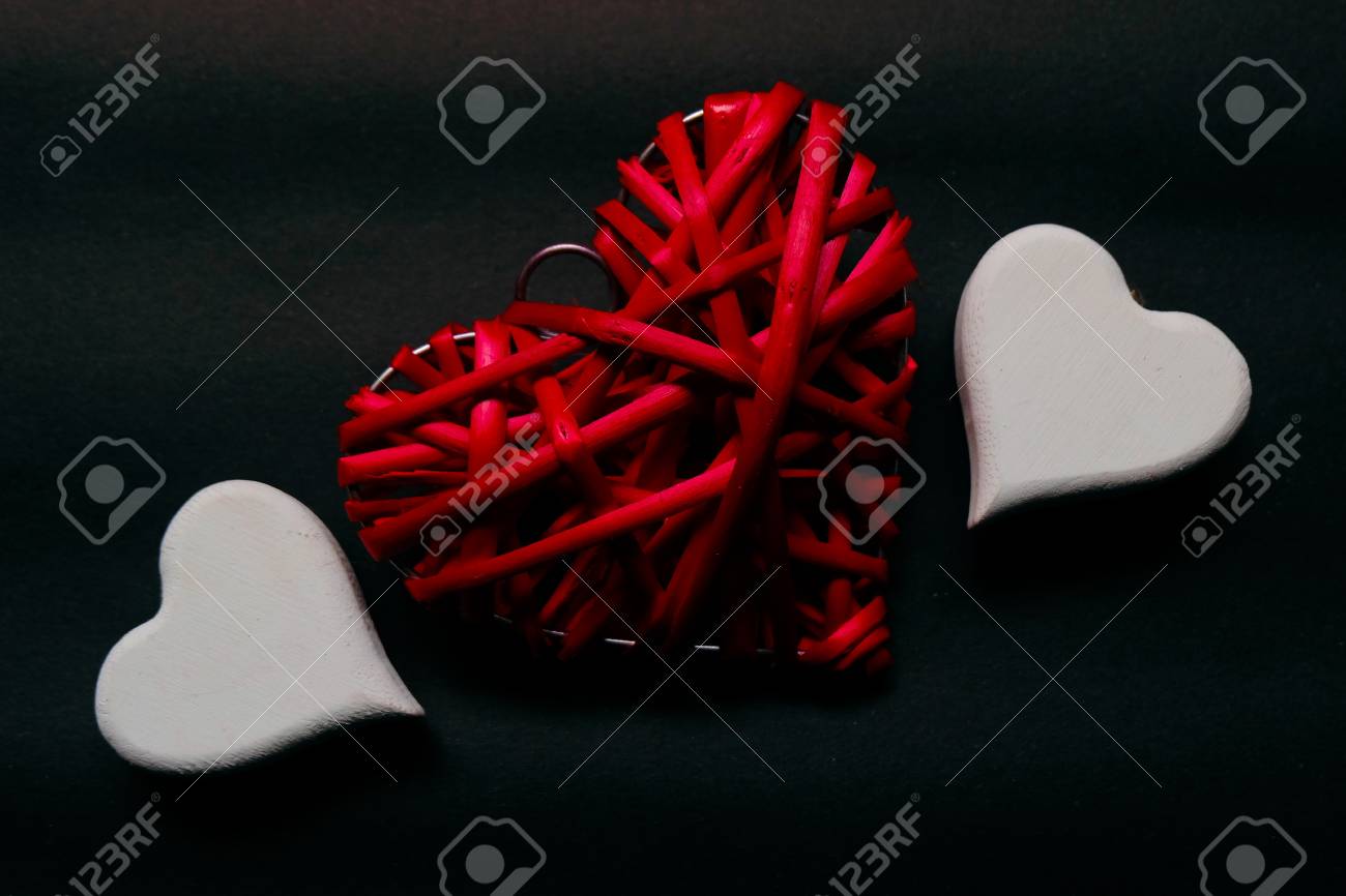 Top View Of Red And White Wooden Handcraft Heart Symbol On Black